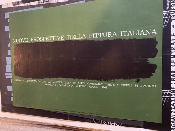 Manifesto / Poster 53 x 69 cm. dell'esposizione Nuove prospettive della pittura italiana Palazzo di Re Enzo Bologna Giugno 1962