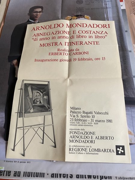 Manifesto / Poster 59 x 42 cm. dell'esposizione Arnaldo Mondadori abnegazione e costanza Palazzo Bugatti Valsecchi Milano 23 febbraio - 31 marzo 1981