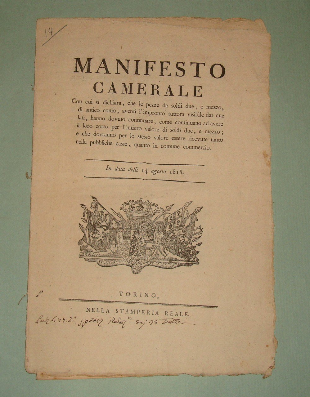 Manifesto Camerale con cui si dichiara che le pezze da due soldi e mezzo di antico conio, aventi l'impronto tuttora visibile dai due lati, hanno dovuto continuare, come continuano ad avere il loro corso per l'intiero valore di soldi due e mezzo; e che dovranno per lo stesso valore essere ricevute tanto nelle pubbliche casse, quanto in comune commercio.