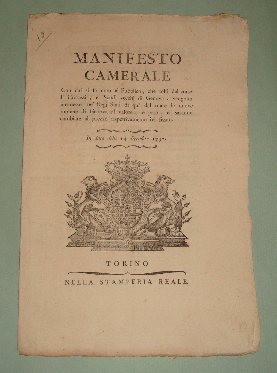 Manifesto Camerale con cui si fa noto al Pubblico che tolti dal corso li Crosassi, e Scudi vecchj di Genova, vengono ammesse ne' Regi Stati di qua dal mare le nuove monete di Genova al valore, e peso, e saranno cambiate al prezzo rispettivamente ivi fissati.