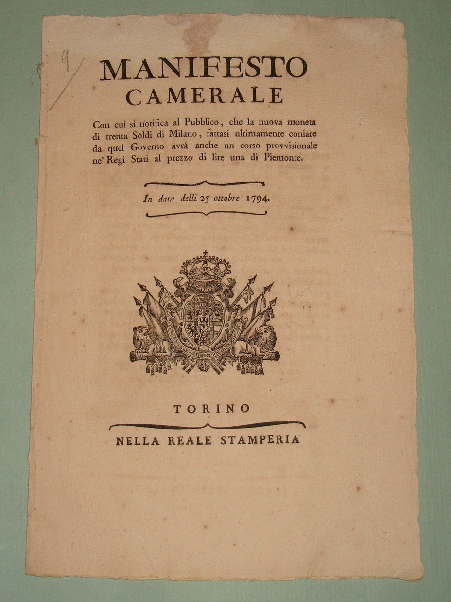 Manifesto Camerale con cui si notifica al Pubblico che la nuova moneta di trenta soldi di Milano, fattasi ultimamente coniare da quel Governo avrà un corso provvisionale ne’ Regi Stati al prezzo di lire una di Piemonte.