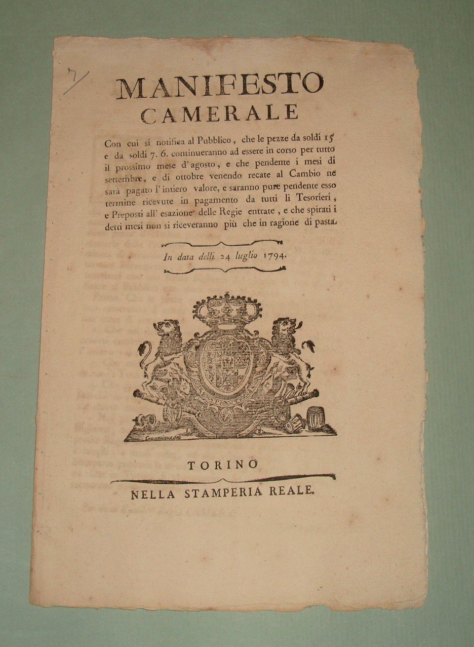 Manifesto Camerale con cui si notifica al Pubblico che le pezze da soldi 15 e da soldi 7.6 continueranno ad essere in corso per tutto il prossimo mese d'agosto e che pendente i mesi di settembre e di ottobre venendo recate al Cambio ne sarà pagato l'intiero valore, e saranno pure pendente esso termine ricevute in pagamento da tutti li Tesorieri e Preposti all'esazione delle Regie entrate, e che spirati i detti mesi non si riceveranno più che in ragione di pasta.