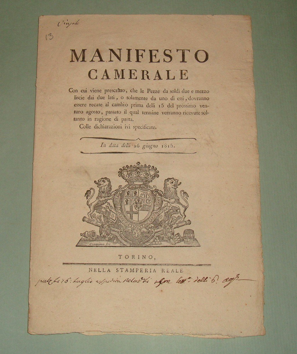 Manifesto Camerale con cui viene prescritto che le Pezze da soldi due e mezzo lisce dai due lati, o solamente da uno di essi, dovranno essere recate al cambio prima delli 15 del prossimo venturo agosto, passato il qual termine verranno ricevute soltanto in ragione di pasta.