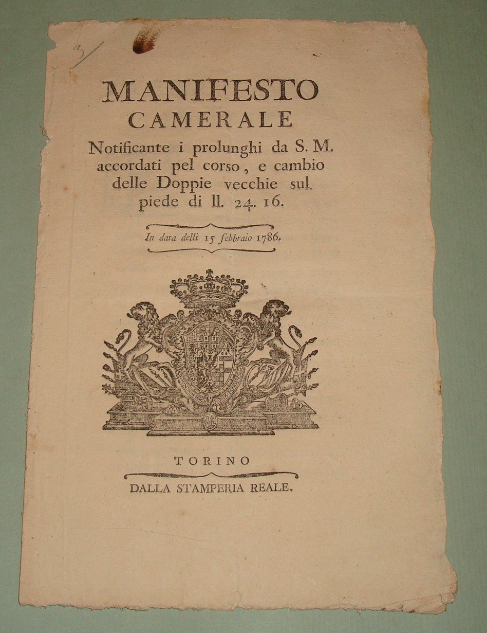 Manifesto Camerale notificante i prolunghi da S.M. accordati pel corso e cambio delle Doppie vecchie sul piede di ll. 24, 16.