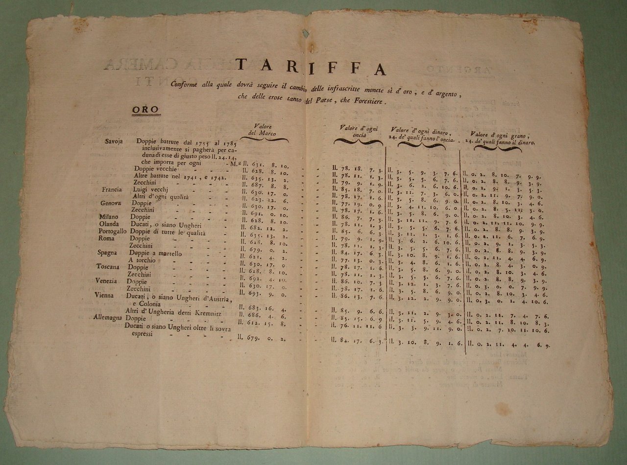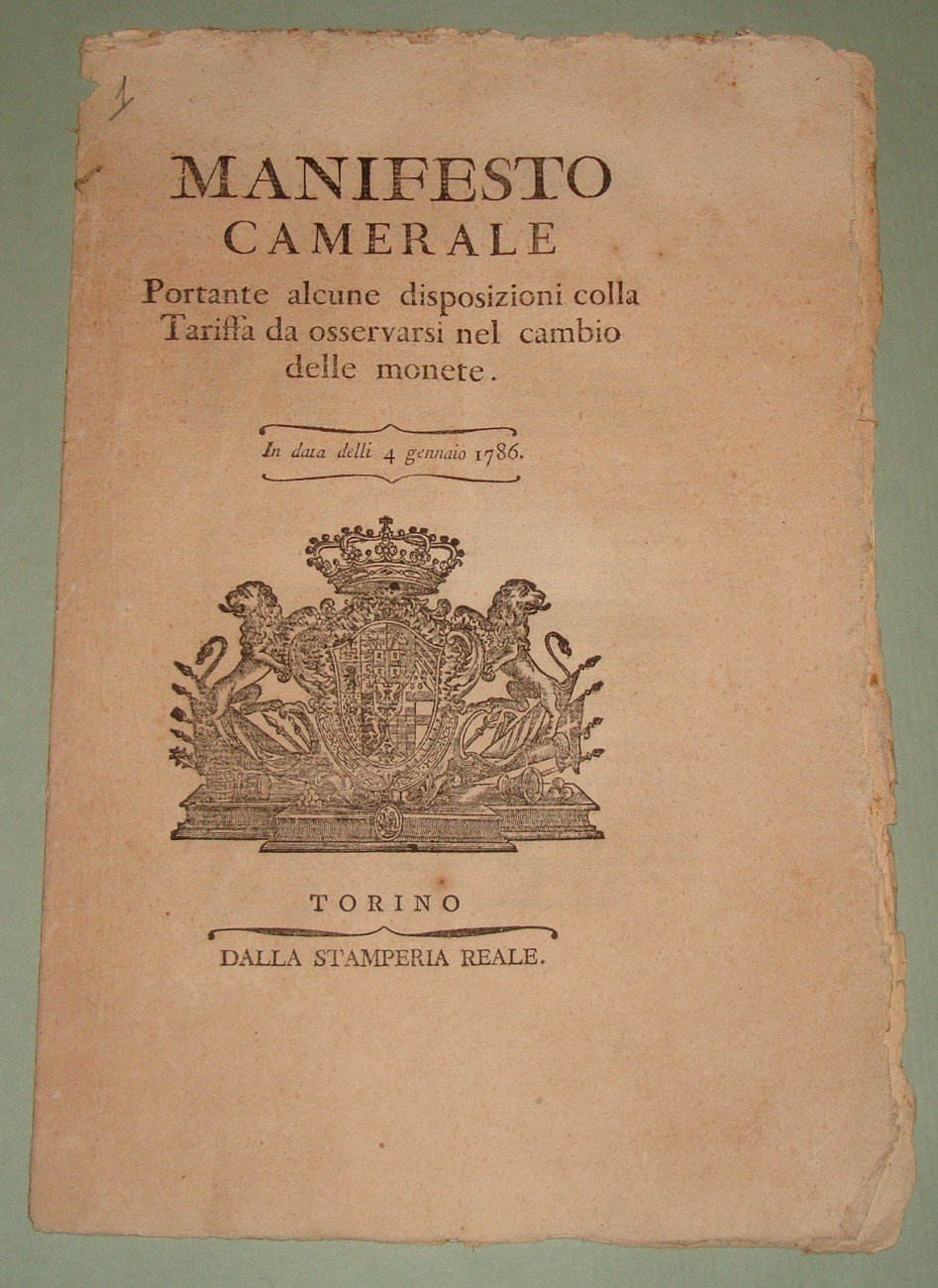 In data delli 4 Gennaio 1786. Torino, Stamperia Reale. Cm.30x20. 8 pagine n.nn. Stemma reale al frontespizio. 1 capolettera inciso. Le tariffe dell’oro, dell’argento e delle monete erose.