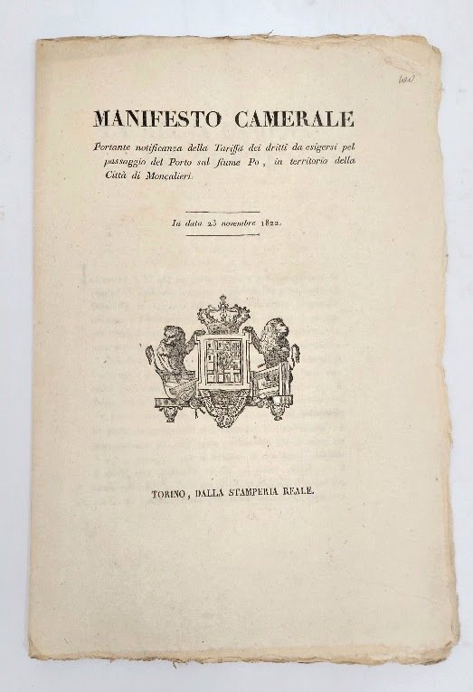 Manifesto camerale portante notificanza della tariffa dei dritti da esigersi pel passaggio del porto sul fiume Po, in territorio della città di Moncalieri. In data 23 novembre 1822.