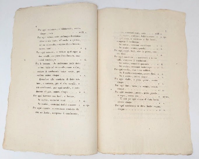 >in-4, pp. 12 (ultima bianca), stemma sabaudo xilogr. al titolo. Rarissimo ed interessante documento ufficiale che riporta le tariffe di passaggio per il porto sul Fiume Po in Moncalieri, stabilite dalla Regia Camera dei Conti, con la specifica spesa per persona, cavallo, asino, carrozza, carro, e relative aggiunte per le merci eventualmente trasportate. Perfetto esemplare.
