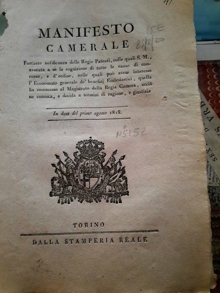 Manifesto camerale portante notificanza delle Regie Patenti, colle quali S.M. avocata a sè la cognizione di tutte le cause di concorso, e d'ordine, nelle quali può avere interesse l'Economato generale de' benefizi ecclesiastici, quella che ha commesso al magistrato la regia Camera, acciò ne conosca, e decida a termini di ragione, e giustizia