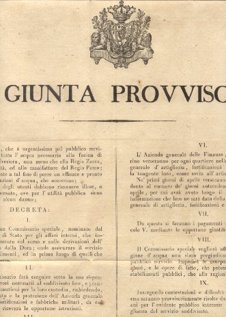 Manifesto col quale la Giunta Provvisoria nel considerare che è urgentissimo per pubblico servizio di assicurare tutta l'acqua necessaria alla fucina di Valdocco, alla polveriera, non meno che alla Regia Zecca, à molini della città . decreta: Sarà stabilito un Commissario speciale che invigilerà particolarmente sul corso e sulle derivazioni dell'acqua proveniente dalla Dora; onde assicurare il servizio de' pubblici stabilimente, ed in primo luogo di quelli che riguardano la guerra. 24 marzo 1821.