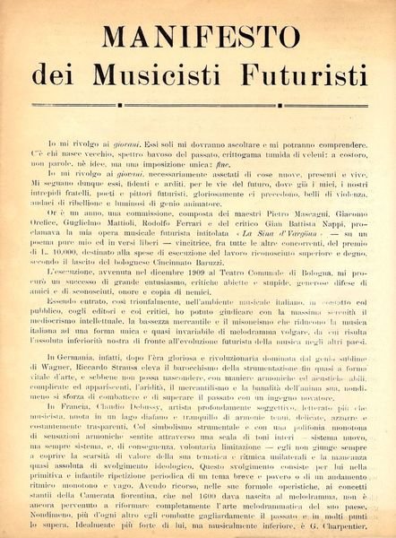 Fascicolo cm. 29 x 23, 4 pagine. Ottimo stato. Terza edizione del Manifesto dei Musicisti Futuristi.