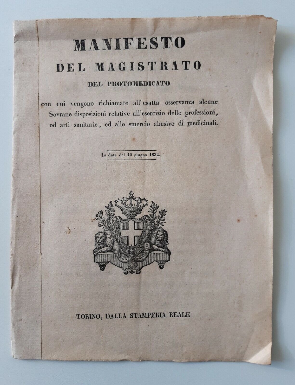 MANIFESTO DEL MAGISTRATO DEL PROTOMEDICATO TORINO STAMPERIA REALE 1832
