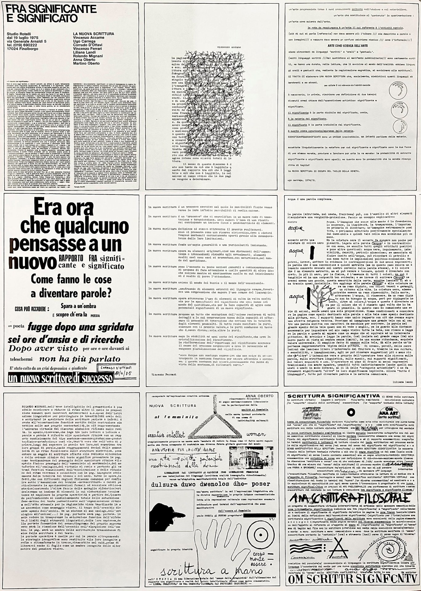 Stampato su carta in occasione della Mostra di Poesia Visiva presso lo Studio Rotelli di Finalborgo, con la partecipazione di Vincenzo Accame, Ugo Carrega, Corrado D'Ottavi, Vincenzo Ferrari, Liliana Landi, Rolando Mignani, Anna Oberto, Martino Oberto. Gli interventi degli artisti sono riprodotti in 9 riquadri differenti, con l'aggiunta del testo di presentazione di Renato Barilli dal titolo "Il riscatto del significante". In ottimo stato. Disponibile anche la copia stampata su cartoncino, con la giustificazione di tiratura, le firme di ciascuno degli artisti e di Barilli.