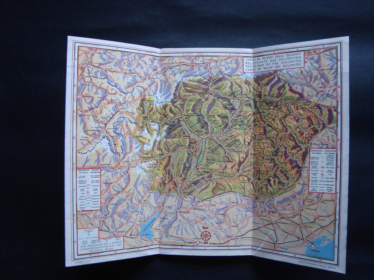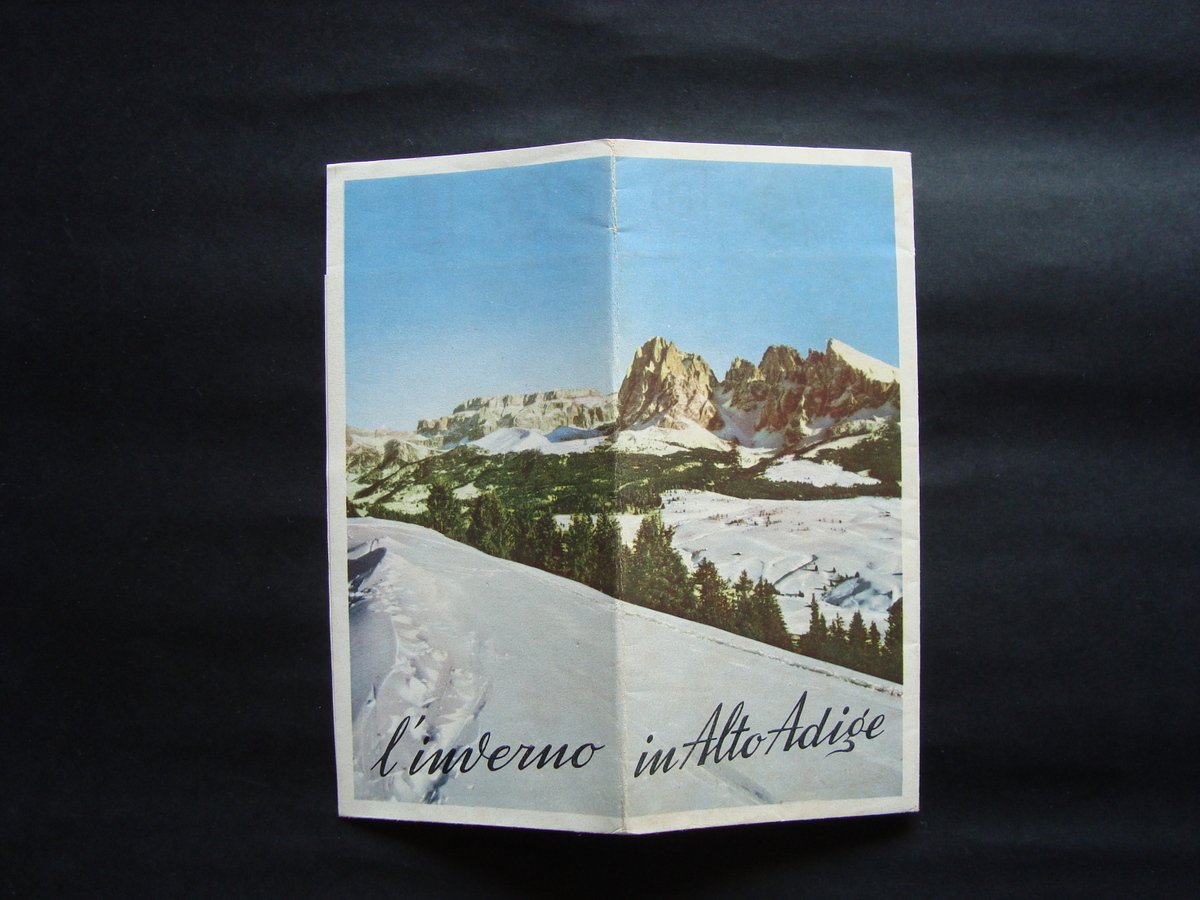 Pieghevole Turistico, L'INVERNO IN ALTO ADIGE Saiga Genova,s.d. anni '50, cm 21 x 9,50 (chiuso), bella carta in rilievo delle Dolomiti, a colori, ill fot.b.n. Condizioni di conservazione. esemplare in buono stato con leggerissime tracce d'uso e del tempo. OPEB.2791 BLU