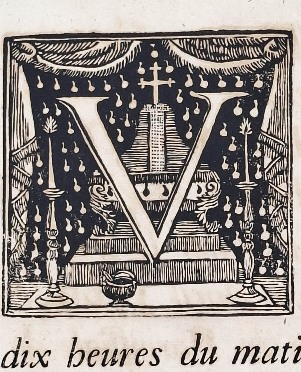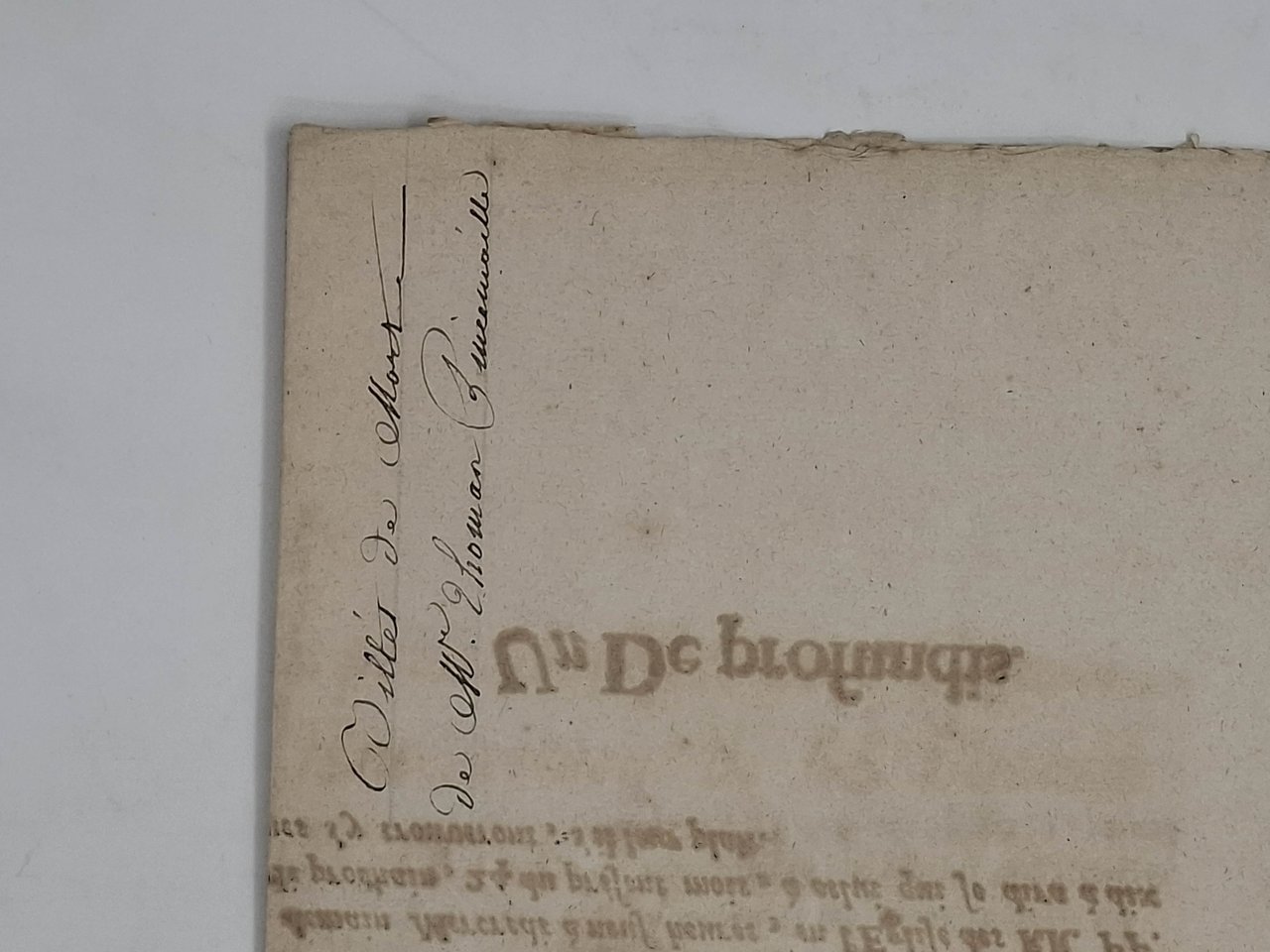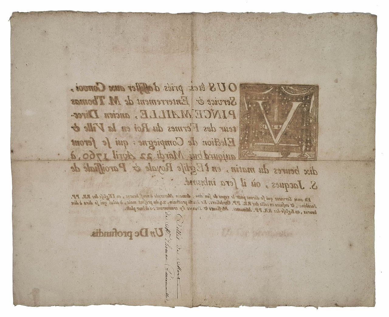 Magnifico manifesto funebre originale, stampato a Parigi nel 1760. Il documento annuncia la morte e i conseguenti funerali, che si sarebbero tenuti martedì 22 aprile 1760, di Thomas Pincemaille, 'ancien Directeur des Fermes du Roi en la Ville'. Lingua del testo: francese. Dimensioni del manifesto: 45 x 36,5 cm circa. Raro documento interessante sia dal punto di vista storico che estetico. Notevole, in particolare, il capolettera xilografato, caratteristica tipica dei manifesti mortuari del '700, ornato con motivi macabri di dimensioni: 9,5 x 9,5 cm circa. A partire dall'invenzione della fotografia (all'incirca metà dell'800) questa tipologia di manifesto subisce profonde trasformazioni con la sostituzione del capolettera con la fotografia del defunto. Stato di conservazione: il manifesto è stato conservato piegato in quattro parti e, di conseguenza, presenta due linee di piegatura, rimanendo piegato è presente, simmetricamente, l'ombra della scritta 'Un De Profundis'. Sul retro è presente una scritta a penna, in corsivo: 'Billet de mort de M. Thomas Pincemaille'.