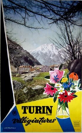 >Manifesto offset cm 62x100, incorniciato. Affiche turistica edita per la promozione del turismo montano ed in particolare delle località alpine che circondano la città di Torino. Destinato alla diffusione presso stazioni ferroviarie ed agenzie di viaggio,reca il logo ENIT (Ente Nazionale Italiano per il Turismo). Non comune. Adalberto Campagnoli (Verona 1905 –Torino 1983) Pittore della scuola torinese vicina a Felice Casorati, dopo un soggiorno a Parigi e in Costa Azzurra, si è dedicato con notevole impegno ai cartelloni di propaganda turistica nel corso degli anni Cinquanta (oltre trenta soggetti reperiti, pressoché tutti per Torino e località piemontesi). Alcuni manifesti risentono di influenza picassiana. Rari i manifesti commerciali, ancora risalenti agli anni Trenta.