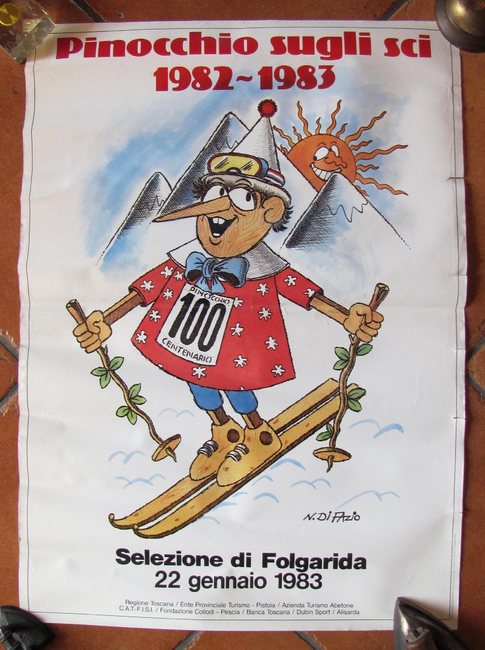 Manifesto - Pinocchio sugli Sci 1982-83 - Selezione di Folgarida 22 Gennaio 1983. Illustrazione di N. Di Fazio. Piccoli taglietti ai margini laterali. 50x70. Raro, Buonissimo stato. , Molto buono (Very Good)