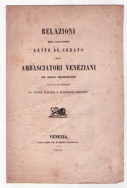 Manifesto. Relazioni degli Stati Europei lette al Senato dagli Ambasciatori Veneziani nel secolo decimosettimo raccolte ed annotate da Nicolò Barozzi e Guglielmo Berchet.