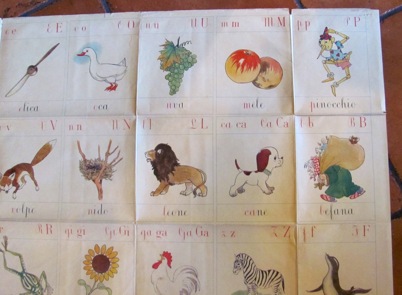 Abbecedario - Grande Manifesto Scolastico illustrato con Pinocchio, la Befana, lo Gnomo, la Sirena ecc. Editore Capriotti - Roma, s.d. anni '40. Foglio più volte ripiegato. Minime imperfezioni ai margini esterni. 107x81,5. Raro e in Buonissimo stato. , Molto buono (Very Good)