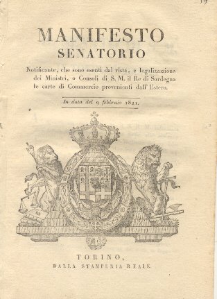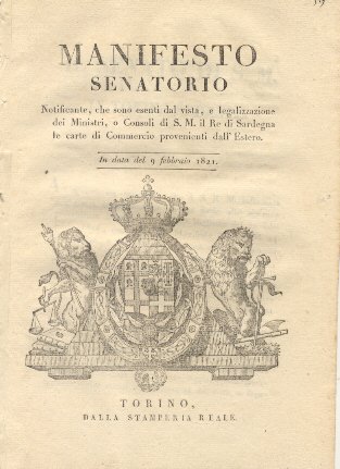Manifesto senatorio notificante, che sono esenti dal vista , e legalizzazione dei Ministri, o Consoli di S.M. il Re di Sardegna le carte di commercio provenienti dall'Estero .9 febbraio 1821.