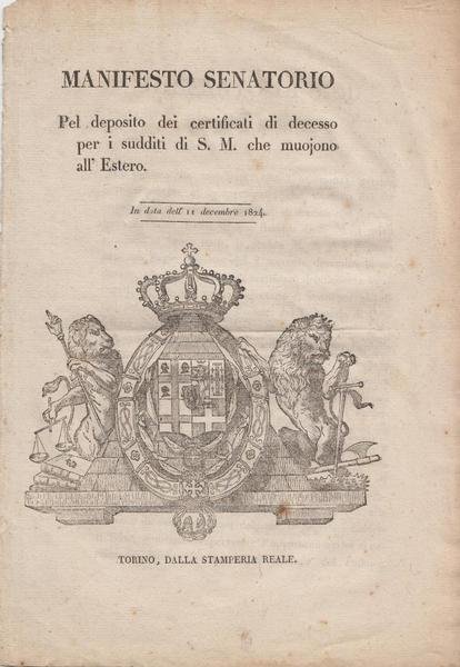 Manifesto Senatorio pel deposito dei certificati di decesso per i sudditi di S. M. che muojono all'Estero. In data dell'11 decembre 1824.
