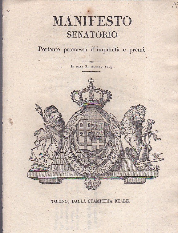 Manifesto senatorio portante promessa d'impunità e premi. In data 31 agosto 1829