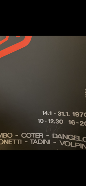 Exhibition Poster Manifesto autografato in basso a destra da Renato Volpini Tra gli artisti presenti all'esposizione oltre a Volpini citiamo: Alviani Aricò Baj Bonalumi Ceroli Colombo Festa Schifano Tadini.