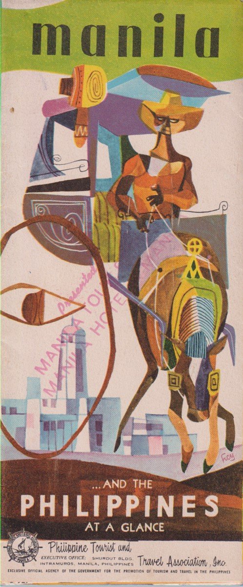 Small faint stamp. ; A colored fold-out with many general travel tips on one side and on the other a map of downtown Manila. Nd. [1960's] ; Narrow 8vo 8" to 9" tall
