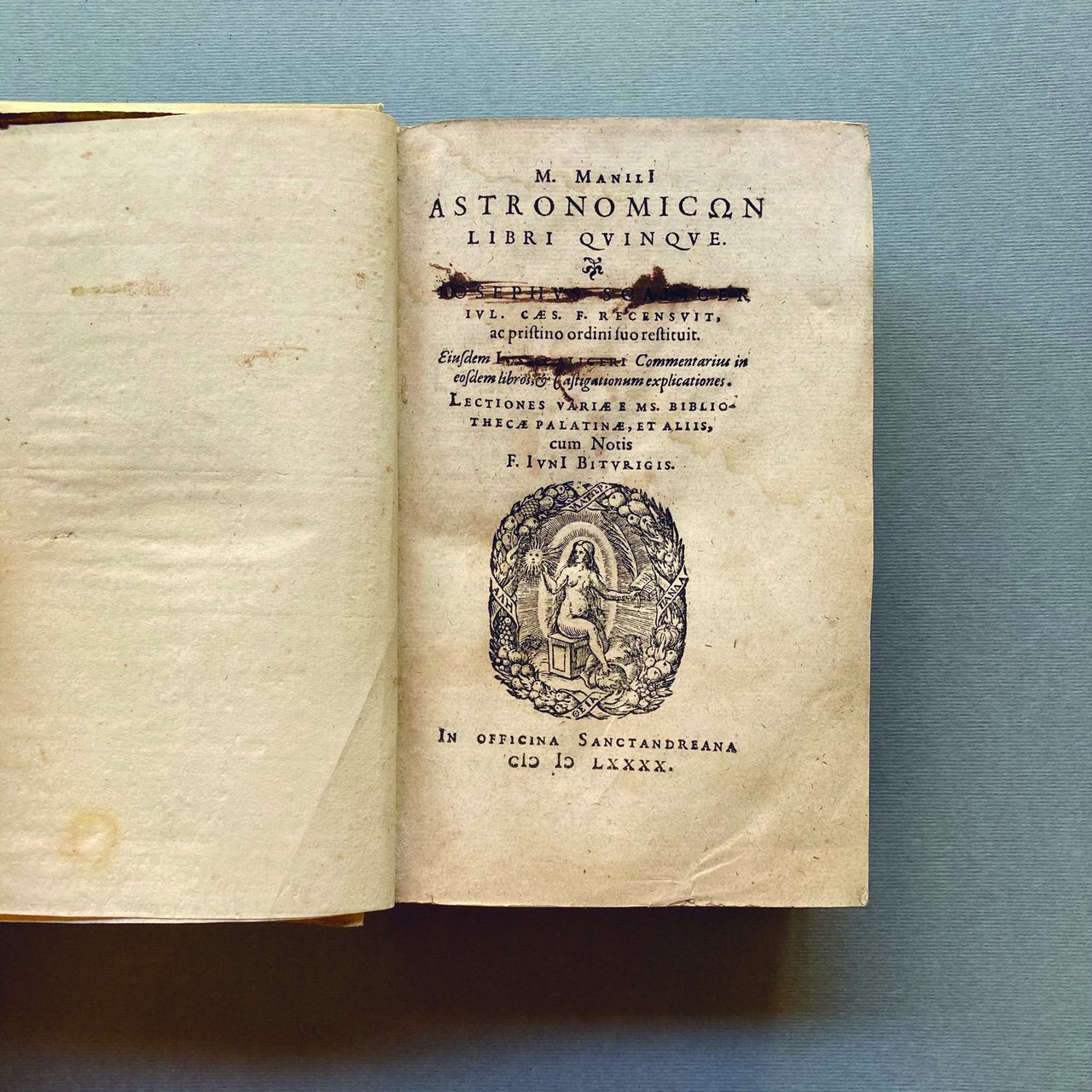 Manili Astronomicōn libri quinque. Iosephus Scaliger Iul. Caes. f. recensuit, ac pristino ordini suo restituit. Eiusdem Ios. Scaligeri Commentarius in eosdem libros, & castigationum explicationes. Lectiones variae e ms. bibliothecae Palatinae et aliis, cum notis F. Iuni Biturigis