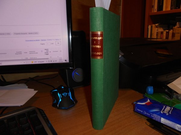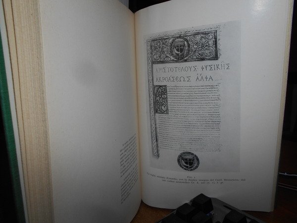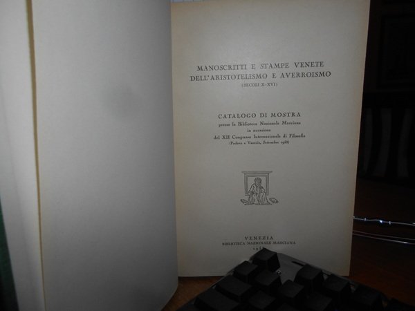 Manoscritti e Stampe Venete dell' Aristotelismo e Averroismo. Catalogo di Mostra presso la Biblioteca Nazionale Marciana in occasione del XII Congresso Internazionale di Filosofia (Padova e Venezia, Settembre 1958). Venezia, Biblioteca Nazionale Marciana, 1958. In-8°, tela verde con titolo in oro entro tassello al dorso, copertine originali conservate. X, 204, (1) pp. con 19 figure in tavole n.t. Perfetto esemplare in legatura artigianale anni '70 con le copertine originali conservate. Uff. C - II - 1