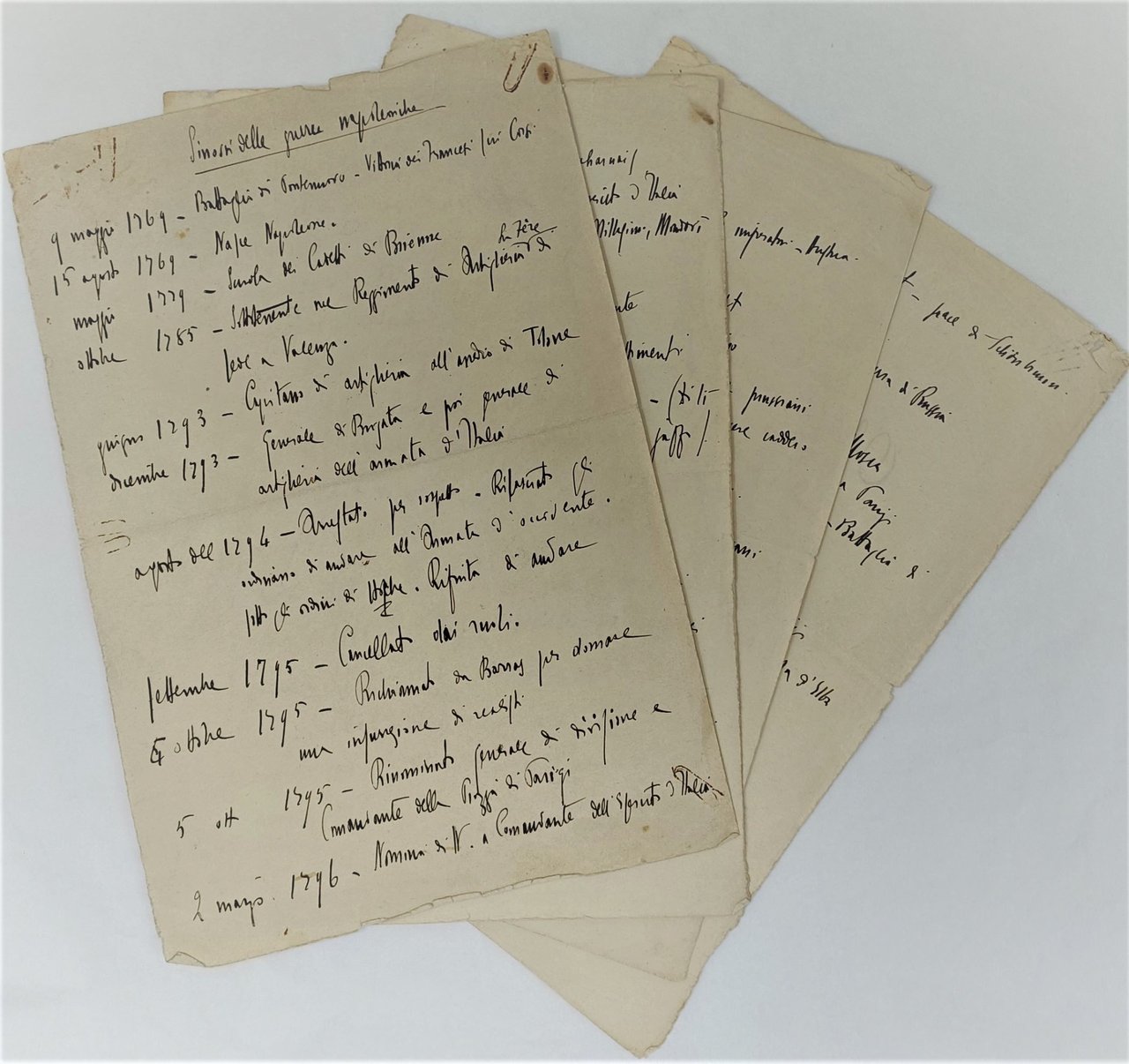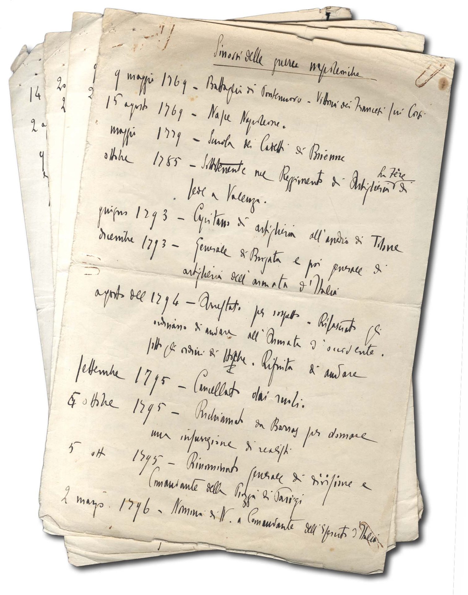 >4 pagine di grande formato (320x218) vergate al solo recto e numerate in alto. Al verso di tre ff. in grafia calligrafica di altra mano indicazione ''Gennaio 1926'', ''Marzo 1926'', ''Ottobre 1926'': i fogli provenivano probabilmente da un'agenda del 1926 e vennero riutilizzati dal Duce. Si tratta di una serie di appunti autografi in cui ordinatamente annota le date e il nome delle Battaglie napoleoniche dal 9/5/1769 (battaglia di Pontenuovo) al 14/6/1815 (Battaglia di Waterloo) e riporta brevi e sporadici commenti sul numero delle vittime o sugli schieramenti. Nota è la passione del Duce per Napoleone tanto che, con l'aiuto di Gioacchino Forzano, compose il dramma teatrale «Campo di maggio» rappresentato per la prima volta a Roma nel 1930; lo spunto decisivo gli era giunto dalla lettura del «Napoleone» di Emil Ludwig ma ne affidò la stesura a un collaboratore di Puccini, che ne seguì con assoluta fedeltà le indicazioni. L'ottimo esito del lavoro incoraggiò Mussolini a proseguire nella collaborazione con Forzano e già nel 1931 fu pronto «Villafranca», il cui protagonista era Cavour e nel 1939 «Cesare», un'opera palesemente autoreferenziale. I presenti inediti fogli testimoniano l'attitudine alla ricerca di Mussolini e il suo attento studio su uno dei suoi personaggi storici preferiti. Tracce di piegatura e qualche arrossamento della carta nel margine superiore bianco, ossidazioni da graffette al recto del 1° ed al verso del 3° foglio.
