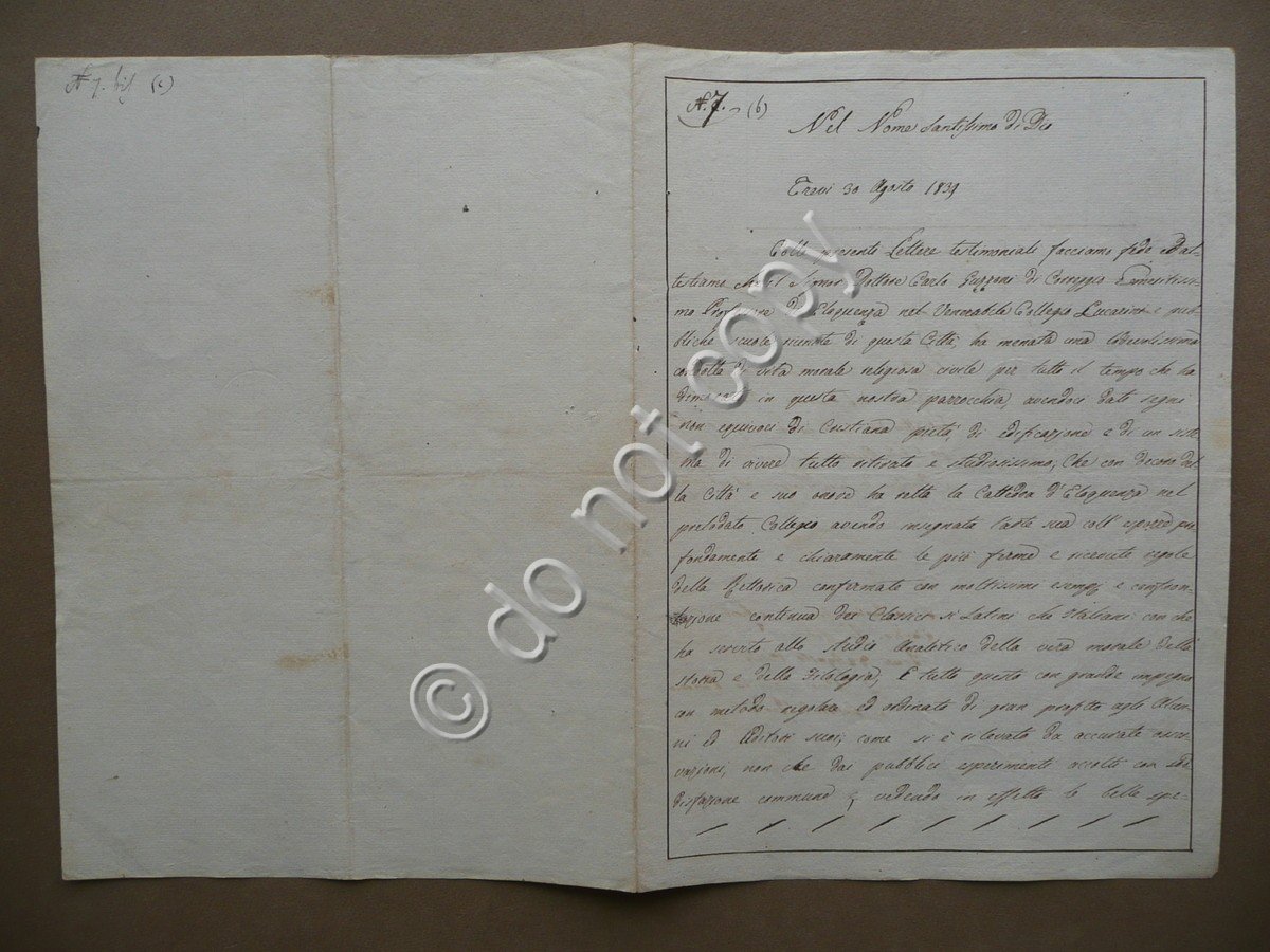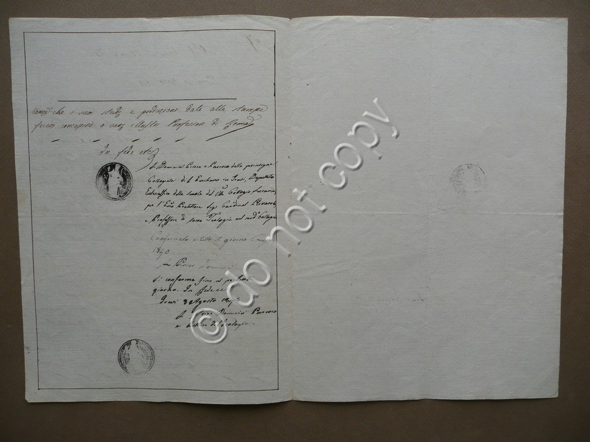 Certificato manoscritto, Colle presenti Lettere testimoniali facciamo fede ed attestiamo che il Signor Dottore Carlo Guzzoni di Correggio Emeritissimo Professore di Eloquenza nel Venerabile Collegio Lucarini [.] ha menata una lodevolissima condotta di vita morale religiosa civile [.]" Trevi, 1839-44, certificato interamente manoscritto su bifolio, testo disposto su due facciate, alla seconda sono presenti due timbretti che ne certificano la validità. Cm 27x19,5. Condizioni di conservazione Esemplare in buone condizioni con tracce d'uso, lievi pieghe di conservazione, qualche lieve brunitura, angoli con minimi trascurabili difetti. Certificato interamente manoscritto che attesta la buona condotta morale del Professorre di Eloquenza Carlo Guzzoni, insegnante al Collegio Lucarini di Trevi. "