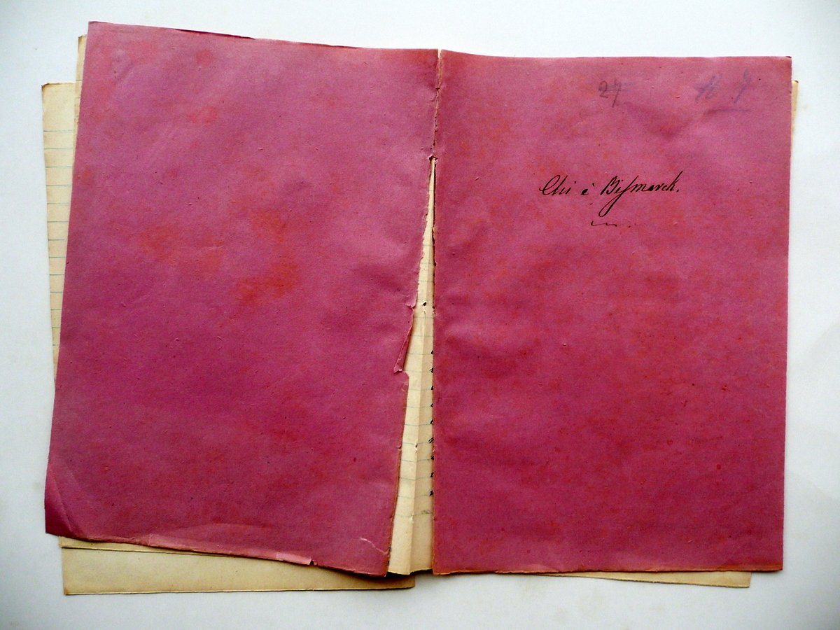 Trattato manoscritto, Chi è Bismarck S. d. (fine Ottocento circa); cm 24,5x17, pp. non num (pp. 18), di cui otto interamente manoscritte (testo fronte/retro); brossura coeva con titolo annotato a mano; margine sup. della brossura ant. con un paio di annotazioni numeriche d'epoca. Condizioni di conservazione Esemplare complessivamente ben conservato con tracce d'uso; brossure con alcune lievi bruniture; dorso con tracce di precedente inserimento dell'esemplare entro volume e uno strappo di vari cm (vedi foto). Interni buoni, staccati dalla brossura; pagine sciolte per mancanza delle cuciture. SC03.D11072 N