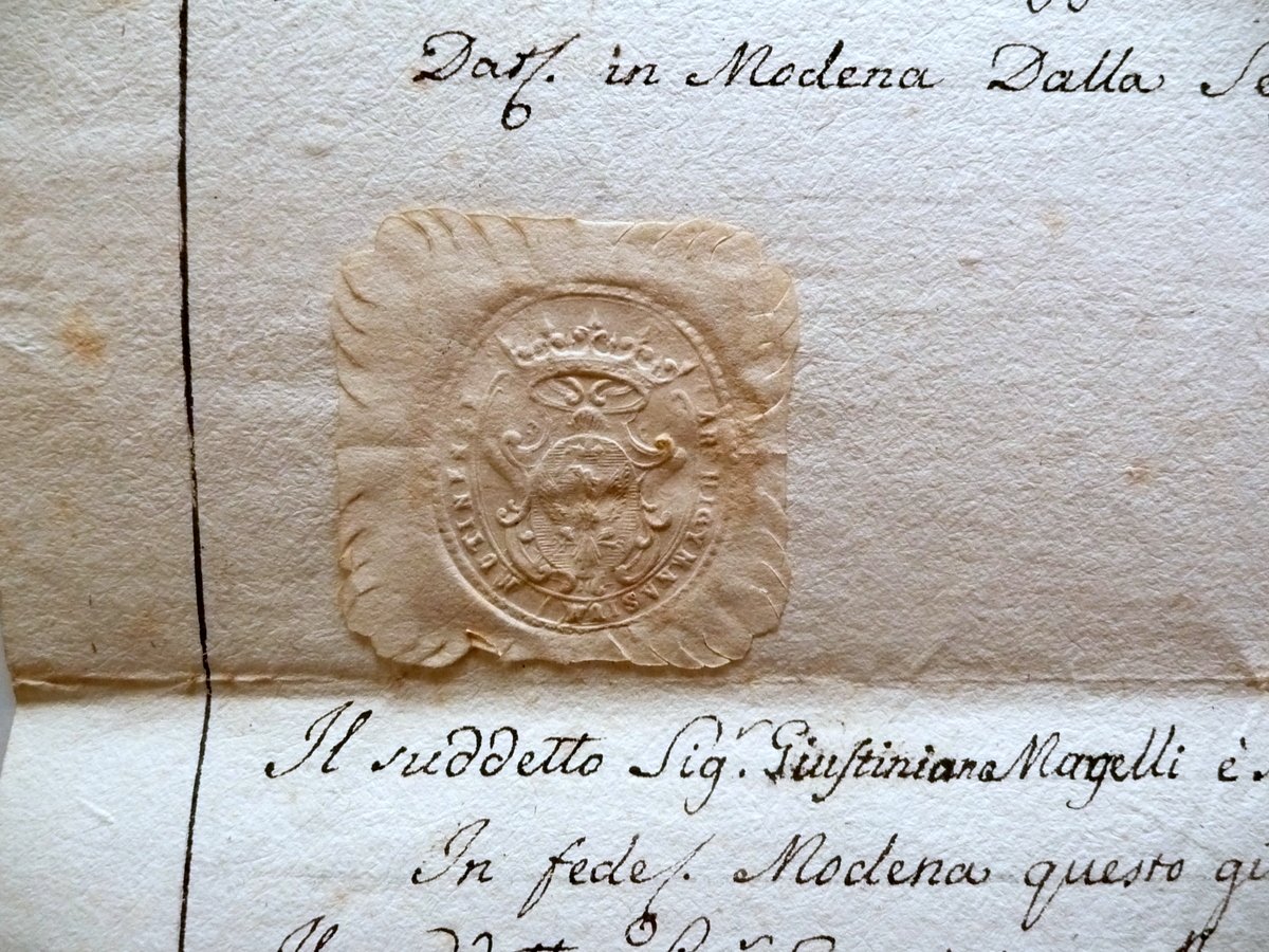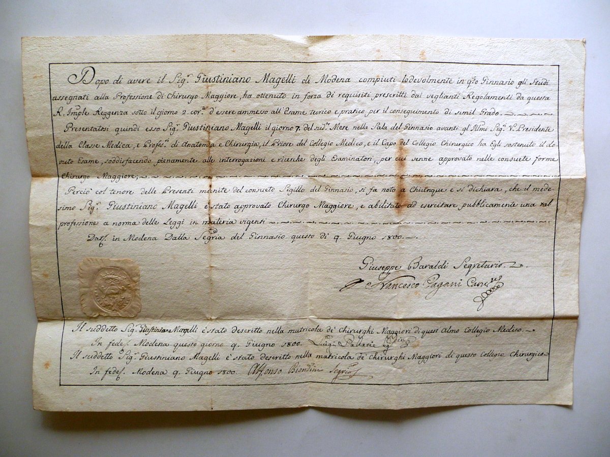 Diploma manoscritto, Diploma manoscritto Rilasciato dal Ginnasio degli Studi di Modena per l'abilitazione all'esercizio della professione di Chirurgo Maggiore Con sigillo in rilievo del Ginnasio e con firme dei segretari e cancelliere Modena, 9 Giugno 1800 1800; Diploma interamente manoscritto su foglio in carta; presenti il sigillo in rilievo del Ginnasio di Modena e le firme dei segretari e del cancelliere, a certificarne la validità. Cm 28x42. Condizioni di conservazione Esemplare in buone condizioni con tracce d'uso, pieghe di conservazione, alcune piccole lievi bruniture; una piega di conservazione con uno strappetto di qualche cm che non compromette la lettura del testo (vedi foto). Retro con tre piccole tracce di precedente applicazione. Bel diploma d'epoca interamente manoscritto, per l'abilitazione alla professione di chirurgo maggiore, rilasciato dal Ginnasio di Modena. Presenza di un bel sigillo in rilievo del Ginnasio, nonché le firme del cancelliere e dei segretari, che ne attestano la validità. SC03.D11109 N