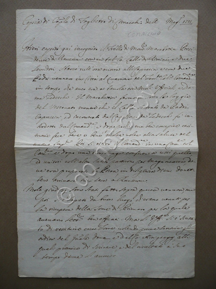 Manoscritto, Copia di Foglietto di Comacchio delli Mag. 1711 Monsignore Marabottini Presidente di Ravenna Ricompensa della Torre di Primaro 1711, foglio volante interamente manoscritto, testo disposto ad entrambi i lati, cm 28x18,5. Condizioni di conservazione Esemplare in buone condizioni con tracce d'uso, piega centrale di conservazione, minimi trascurabili difetti.