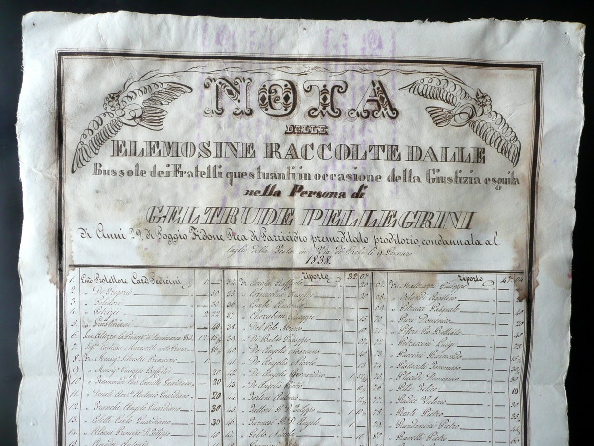 Grande Manifesto Manoscritto Nota delle Elemosine raccolte dalle Bussole dei Fratelli questuanti in occasione della Giustizia eseguita nella Persona di Geltrude Pellegrini di anni 29 di Poggio Fidone Rea di Parricidio premeditato condannata al taglio della testa in Via de' Cerchi li 9 Gennaio 1838" Manifesto,cm. 44x58, testo interamente manoscritto su carta forte con bei fregi a mano. Condizioni di conservazione Esemplare in condizioni più che discrete con tracce d'uso, pieghe di conservazione, leggere gore di umidità che non compromettono la lettura del testo e qualche piccola traccia di vecchia umidità; cornice con strappetti di qualche cm; parte sup. con aloni da inchiostro causate dall'umidità (oggetto danneggiato durante alluvione dei locali della libreria in seguito a maltempo). Oggetto unico, di ottima qualità esecutiva, argomento particolarissimo. Condizioni come da foto e da descrizione. SC03.D13439 N "