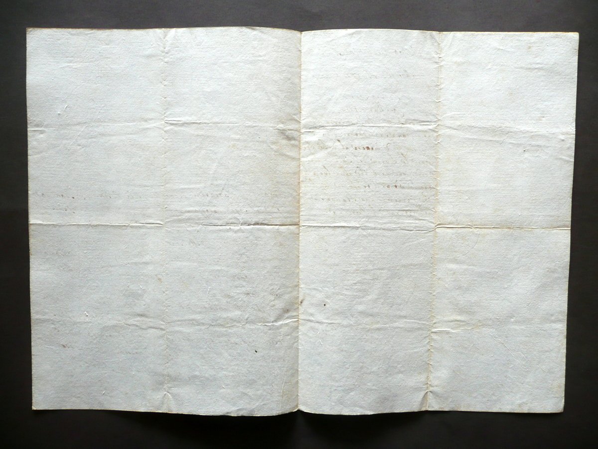 Manoscritto, Francesco Lazzarini decorato della Patente di Stampatore del Sagro Palazzo Apostolico, ossequiosamente espone all'Eccellenza Vostra, che venga osservato non solamente il segreto della stampa [.] ma inoltre regolare il tutto, onde non si possa neppure conoscere il tempo, in cui dette stampe segrete hanno luogo; [.]" Lettera / richiesta interamente manoscritta su bifolio in carta, datata 1815; testo disposto alla prima e, su colonna, all'ultima facciata (all'ultima è presente la risposta alla suddetta richiesta e la firma del richiedente, vedi foto). Cm 27x19,5. Condizioni di conservazione Esemplare ben conservato con tracce d'uso, pieghe di conservazione, alcune piccole leggerissime bruniture. Curiosa e interessante richiesta di dotare della livrea di palazzo il servitore dello stampatore, per non destare sospetti e mantenere segrete le operazioni di stampa. SC03.D12862 N "
