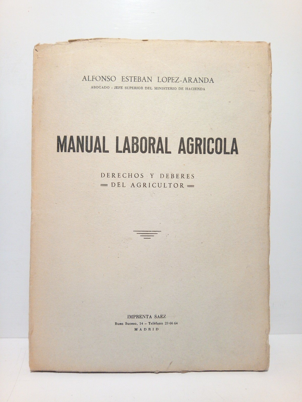 Madrid: Imp. Sáez, [ca. 1950].- 103 p.; 4º menor (21 x 15,3 cm); Cartulina Ed.- RARO.* TRABAJO, DERECHO LABORAL, SOCIAL Y RELACIONES CON LA EMPRESA