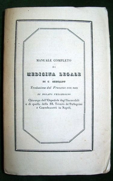 Manuale completo di medicina legale, considerata in relazione colla vigente legislazione. Opera diretta a' medici, avvocati e funzionarii giuduziarii. Accresciuta di un riassunto dell'opera di Orfila, su progressi della putrefazione nella terra, e ornata di quattro rami. Traduzione dal francese con note di Donato Pellegrino