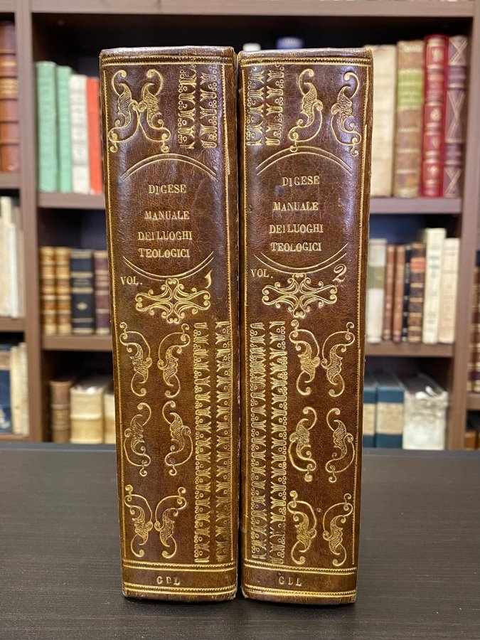 2 volumi in-8° (cm. 19,8), gradevolissime legature coeve in mezza pelle, dorsi lisci con titolo e ricchi fregi romantici in oro, piatti in percallina nera floreale (segno di tarlo, tracce d'uso); pp. VI 672 VII-VIII, 700 in buono stato (lievi fioriture sparse, alcune gore alle ultime carte del vol. I con in fine le pp. VII-VIII contenti l'Indice); simboli religiosi incisi in xilografia al frontespizio. Non comune. Elegante esemplare. (NO8)