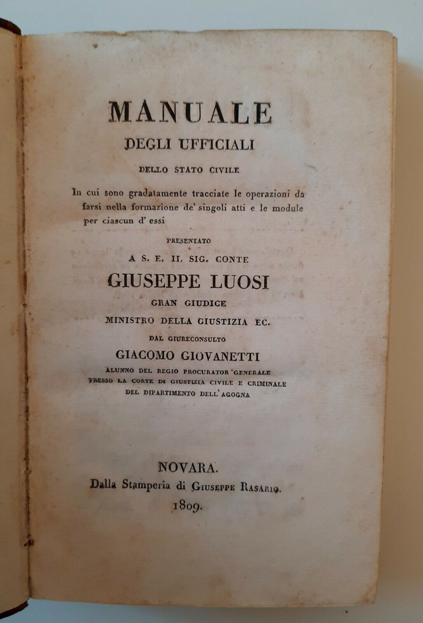 MANUALE DEGLI UFFICIALI DELLO STATO CIVILE G. GIOVANNETTI NOVARA RASARIO 1809