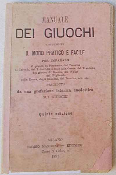 Manuale dei giuochi contenente il metodo pratico e facile per imparare il giuoco di Picchetto, del Tresette, di Trionfo, del Trionfetti o gilè alla Greca, del Trentuno, del giuoco di Boston, del Whist, del bigliardo, della Dama, degli Scacchi, del Domino,