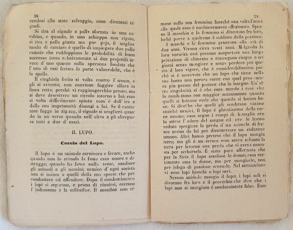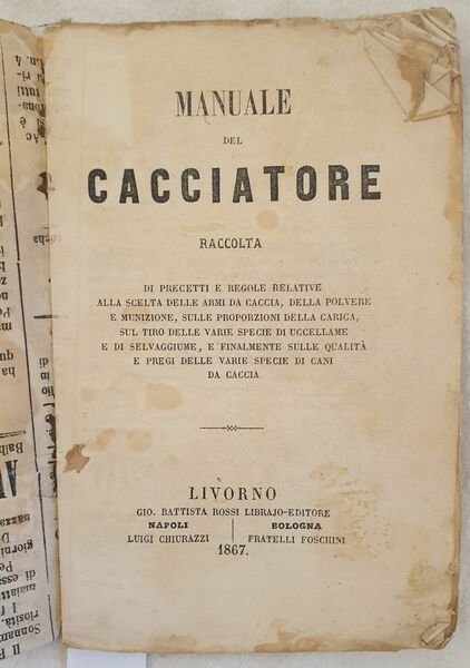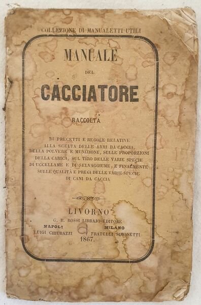 Rarissimo manuale del cacciatore del 1867 di G. B. De Rossi. Il nome dell'autore si evince dalla firma al verso del frontespizio che certifica l'autenticità del volume. All'interno: caccia, armi (scelta di un'arme e modo di provare un fucile), Tiro alla pernice, Caccia del cervo, Del capriolo e della caccia al capriolo, Cinghiale, caccia del lupo, caccia della volpe, della lepre, del coniglio, del fagiano, Tiro alla pernice, Tiro della quaglia, Tiro degli uccelletti, Tiro degli uccelli in generale, Cani da caccia. In discrete condizioni . Copertina editoriale in mediocri condizioni generali con usure ai margini e dorso. Gore d'umidità. Legatura in discrete condizioni con lievi rotture. All'interno le pagine si presentano in buone condizioni con rare fioriture. Piegature agli angoli delle prime 20 pagine. In 16. Dim. 16x10,5 cm. Pp. 52.