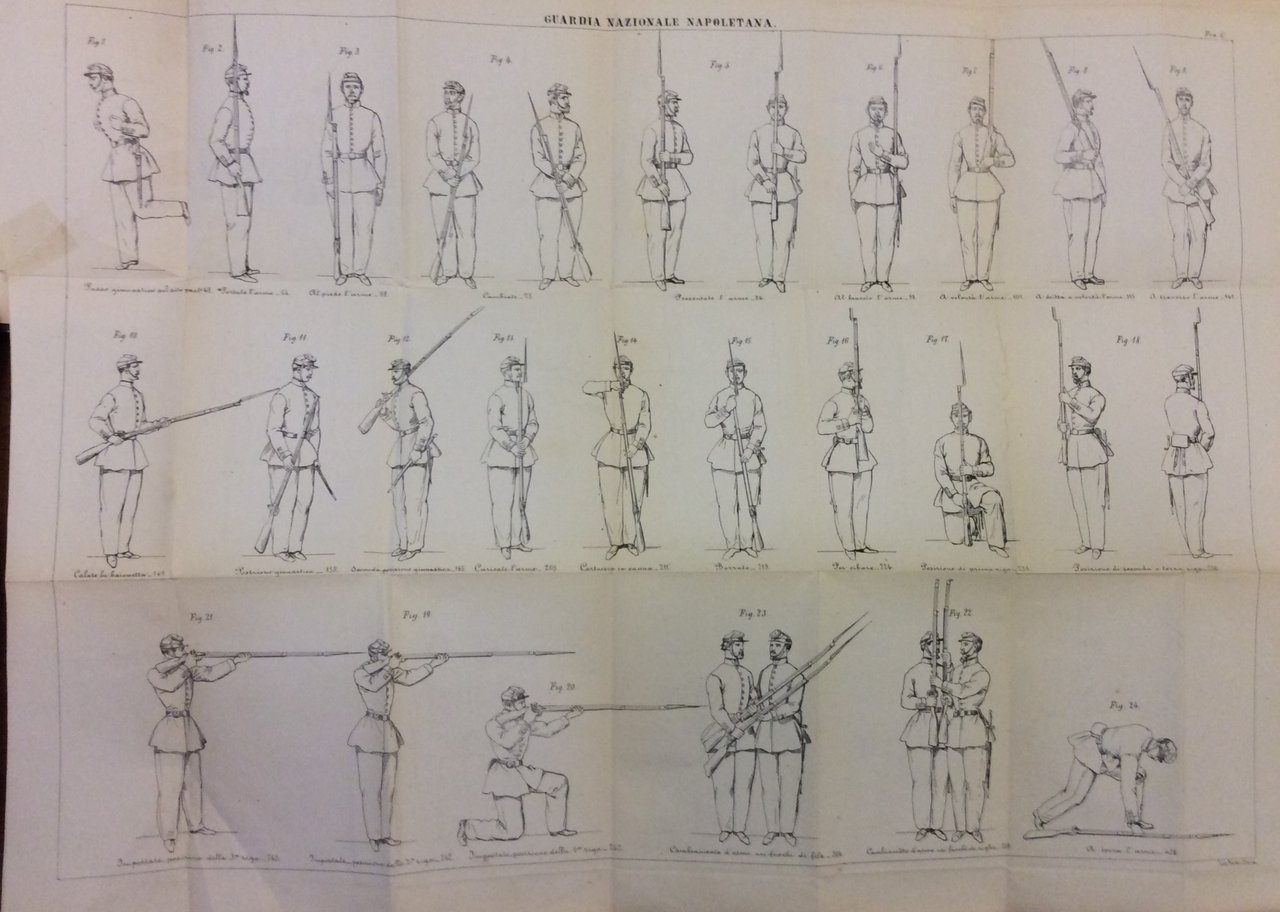 In-24 gr. (mm. 135x89), 2 parti in 1 vol., mz. pelle coeva, filetti e titolo oro al dorso, pp. (4),169; VI,77,85; con 3 tavole fuori testo, più volte ripieg., ciascuna con numerose figure relative a: fucile a percussione e pezzi che lo compongono e alla guardia napoletana (soldati armati, nelle diverse posizioni). La prima parte è interamente dedicata al fucile. La seconda contiene: Articoli tratti dalla Ordinanza di S.M. pel governo, il servizio e la disciplina delle Reali Truppe nelle piazze, Napoli 1831. Ben conservato.