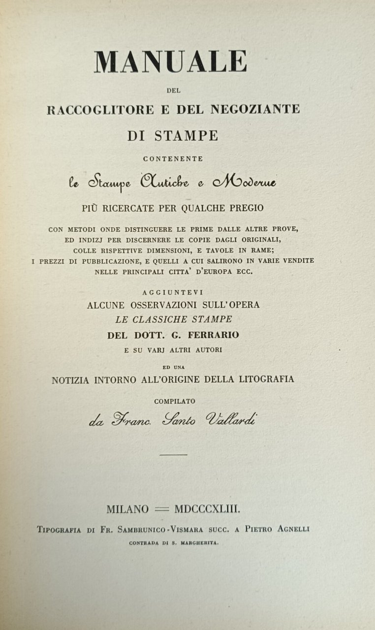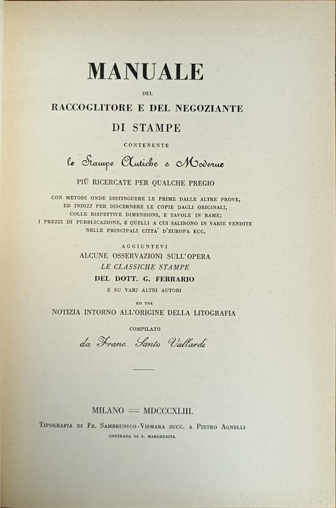 MANUALE DEL RACCOGLITORE E DEL NEGOZIANTE DI STAMPE CONTENENTE LE STAMPE ANTICHE E MODERNE PIU' RICERCATE PER QUALCHE PREGIO