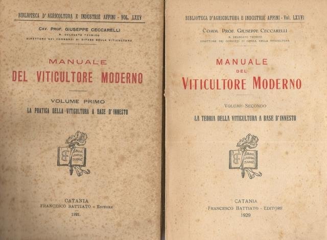 Francesco Battiato Editore, Catania, 1921 – 1929. Biblioteca d'Agricoltura e Industrie Affini – Vol. LXXV. Due volumi in 8vo, volume primo: “La pratica della viticoltura a base d'innesto”pp. 236 con Indici; volume secondo: “La teoria della viticoltura a base d'innesto”, pp. 294 con Indici, bross. in carta. Compilazione rara a reperirsi completa dei due volumi perché il volume secondo apparve dopo otto anni dal primo. Il volume primo presenta fioriture alla brossura e ai tagli, il secondo si presenta pulito, entrambi sono ancora intonsi.