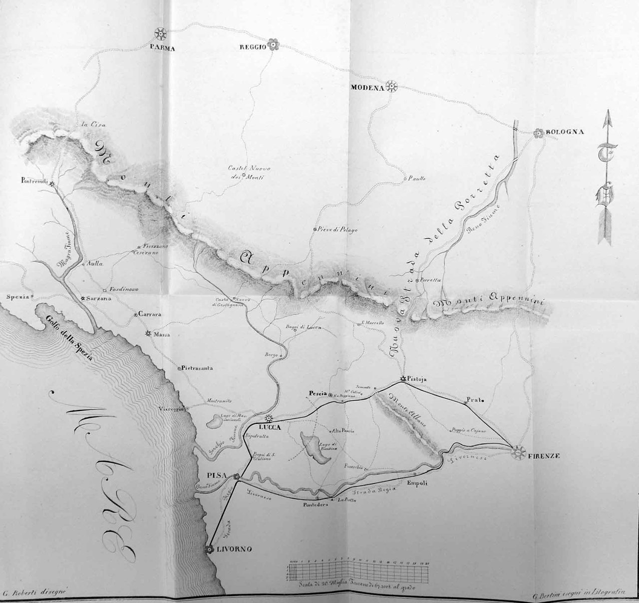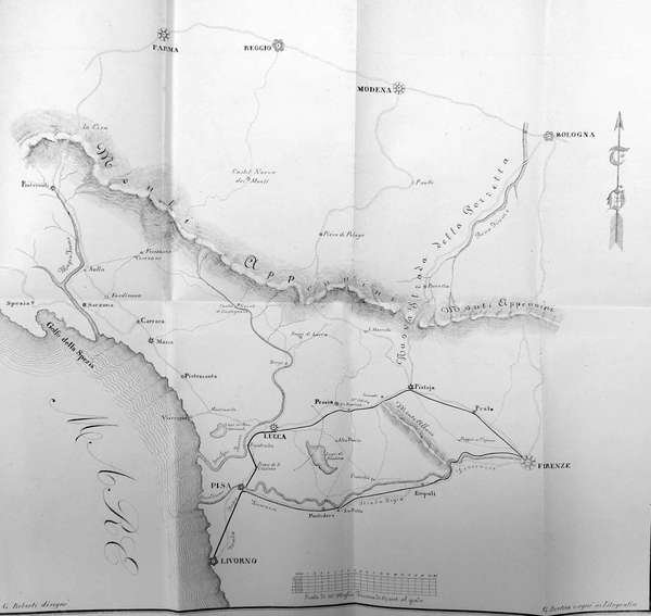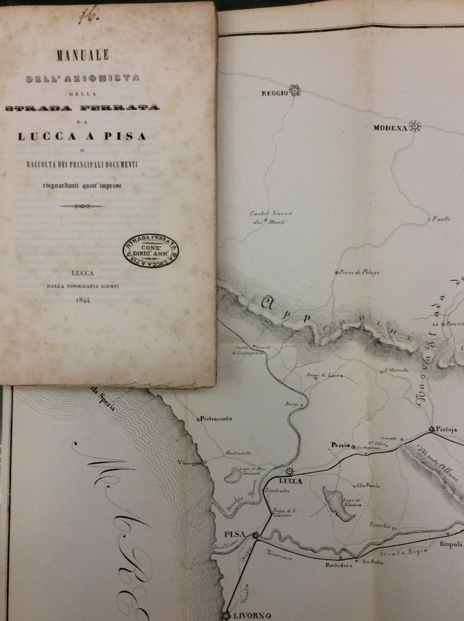 In-8 p. (mm. 217x135, brossura muta coeva, pp. VII,120, con: una grande carta topografica della Strada Ferrata Leopolda (da Livorno a Firenze) - di mm. 480x845 - (angolo bianco super. con manc.), 2 tabelle ripieg. relative alla spesa e al prodotto presuntivo lordo di tale strada ferrata ed un numero del Giornale privilegiato di Lucca, politico-letterario (n. 1969, venerdì 2 agosto 1844), che contiene un articolo dedicato alla Strada Ferrata da Lucca a Pisa.In questo Manuale vi sono contenuti: sovrane concessioni di S.A.R. il Duca di Lucca - Statuti della Società - Annunzio delle concessioni preliminari del Granduca di Toscana - Manifesto del 28 Febbraio 1842 - Capitoli intorno alla costruzione del tronco lucchese approvati da S.A.R. il Duca di Lucca - Manifesto che annunzia costituita Società Anonima - Avviso del compiuto collocamento delle azioni, ecc. ecc..Solo qualche lieve fiorit. ma certamente un buon esemplare.