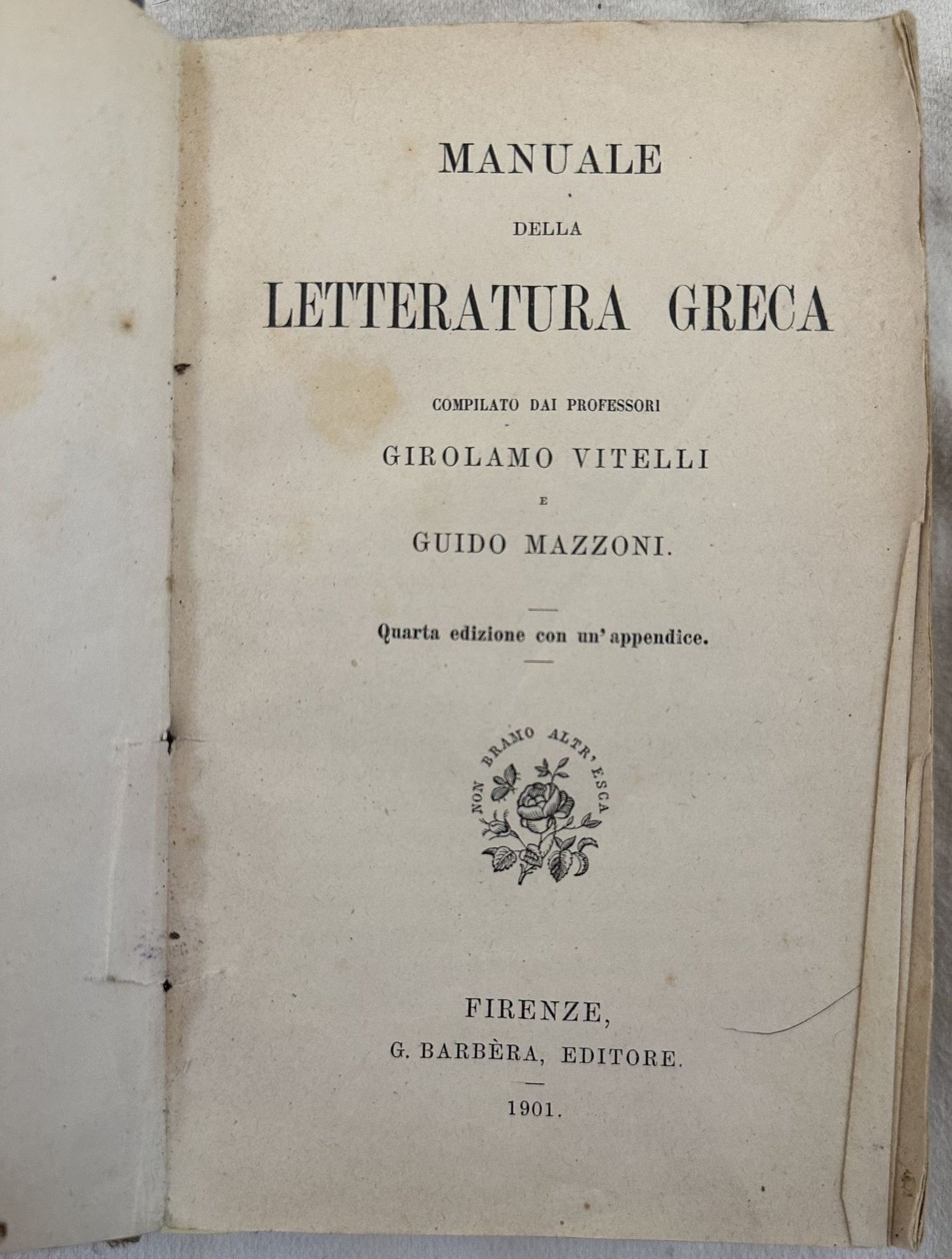 Edizione del 1901 di questo manuale della letteratura greca compilato da Girolamo Vitelli e Guido Mazzoni. All'interno poesia epica, lirica, melica, drammatica, storia, eloquenza, filosofia, Età Alessandrina, Età Romana, Da Costantino a Giustiniano ecc. In discrete condizioni. Copertina in mezza tela in mediocri condizioni con usure e rotture. Legatura in discrete condizioni e corpo del libro completamente staccato dalla legatura. Pagine in buone condizioni. In 8. cm. 19,5x12,5. Pp. VIII+673+(1). Edition of 1901 di questo manuale della letteratura greca compilato da Girolamo Vitelli e Guido Mazzoni. All'interno poesia epica, lirica, melica, drammatica, storia, eloquenza, filosofia, Età Alessandrina, Età Romana, Da Costantino a Giustiniano ecc. In discrete condizioni. Copertina in mezza tela in mediocri condizioni con usure e rotture. Legatura in discrete condizioni e corpo del libro completamente staccato dalla legatura. Pagine in buone condizioni. In 8. cm. 19,5x12,5. Pp. VIII+673+(1). Editorial cover in fair conditions lightly worn in the extremities. Binding in fair conditions with cracks. Pages in good conditions. In 8. cm. 19x12. Pp. XXIV+400.