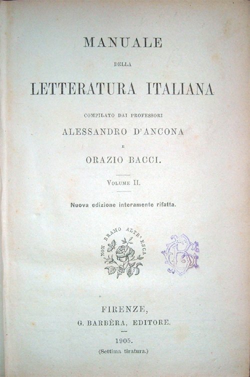 Manuale della letteratura italiana compilato dai professori Alessandro D'Ancona e Orazio Bacci. Volume II. Nuova edizione interamente rifatta. Settima tiratura