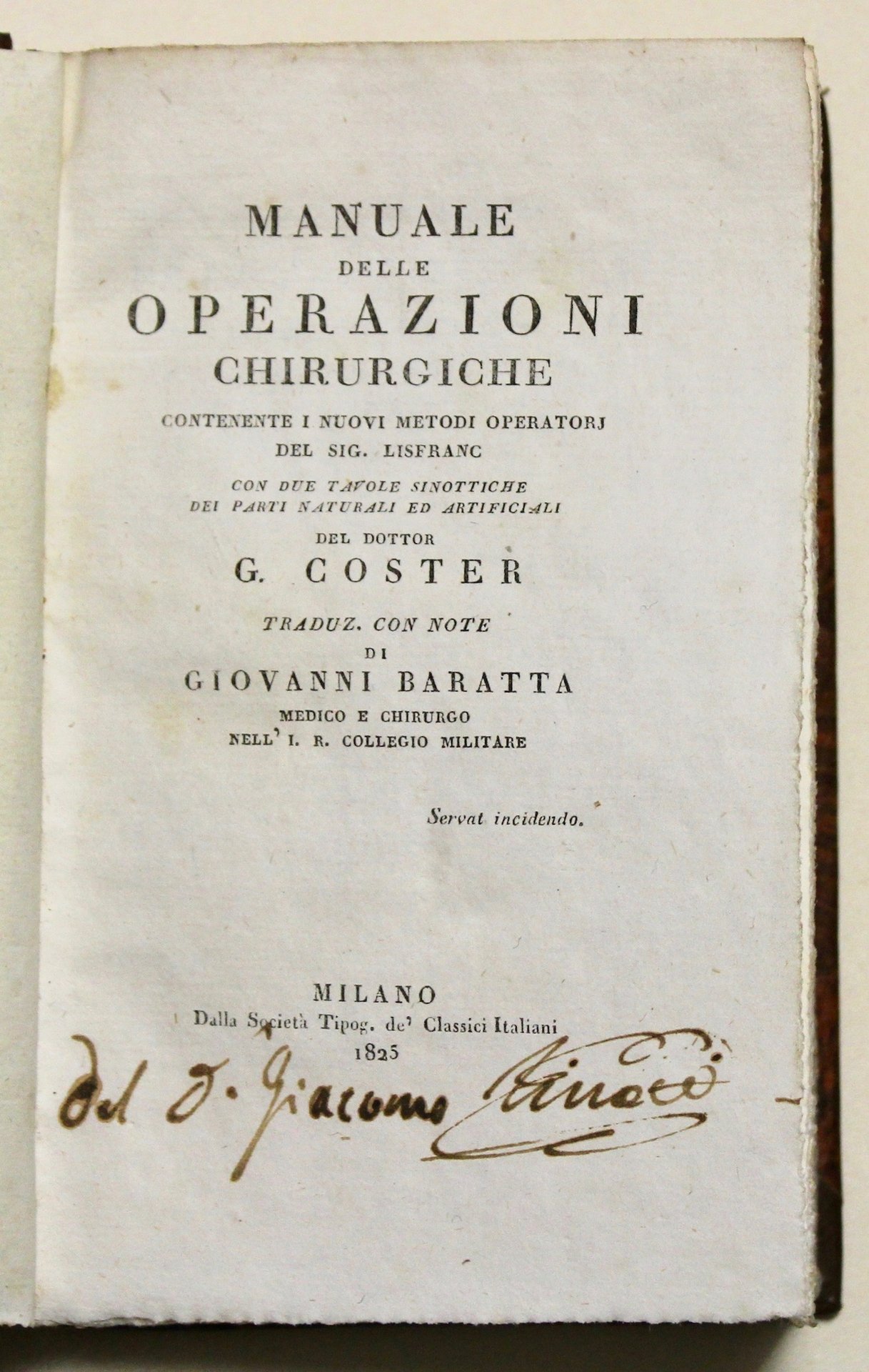 Manuale delle operazioni chirurgiche contenente i nuovi metodi operatorj del sig. Lisfranc con due tavole sinottiche dei parti naturali ed artificiali del dottor G. Coster traduz. con note di Giovanni Baratta
