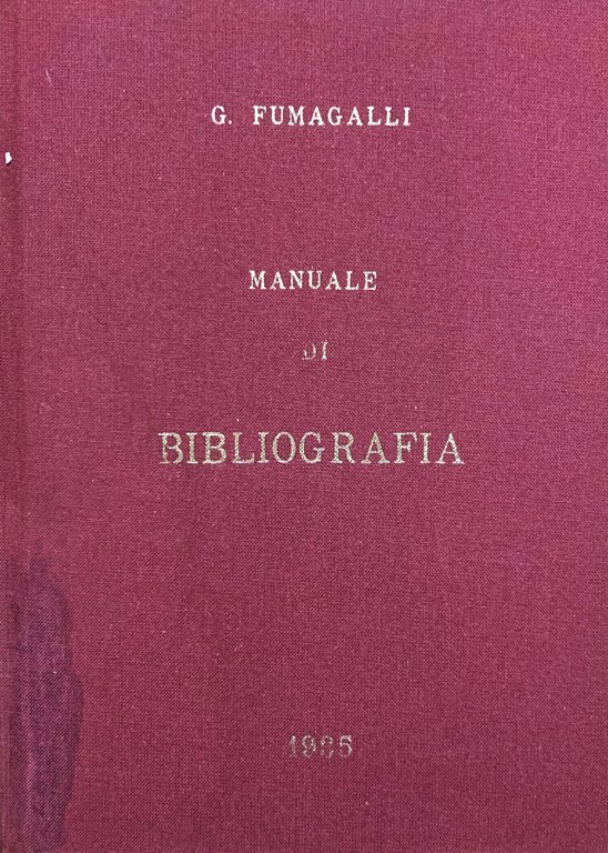 Riproduzione xerografica della IV ed. del manuale, riveduta e arricchita da G. Fumagalli e Olga Pinto (Milano, Ulrico Hoepli Edityore-Libraio della Real Casa 1935-XIII). VIII/ XXIV+488+(8)/ rilegatura in tela bordeaux con titoli dorati. Con 165 figure in nero. Stato buono (tracce di umidità in copertina - le sottolineature della copia originali sono riprodotte in questa copia). Indice: Prefazione; G. Fumagalli, bibliotecario emerito (Firenze, Istituto Italiano del Libro, 1^ settembre 1934-XII) - Indice del volume - Indice delle figure - Il libro prima dell'invenzione della stampa - Invenzione e progressi della tipografia - Il libro dopo l'invenzione della stampa - Gli ornamenti del libro - Biblioteche e cataloghi - Bibliografia. Commercio librario. Libri rari - Indice dei nomi e delle cose notabili.